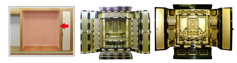 仏間の広さは、安置する部屋の広さなどを参考に、三尺、一間など半間以上ならば大型仏壇を、半間スペースならば標準型仏壇、仏間がなく、タンスの上などに安置したいならば上置型仏壇などが適しています。